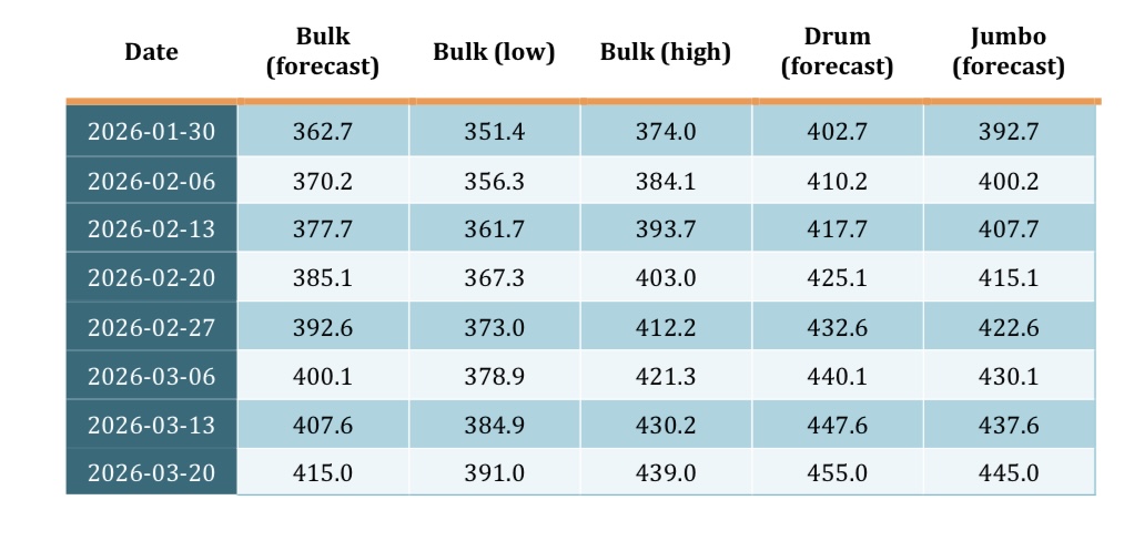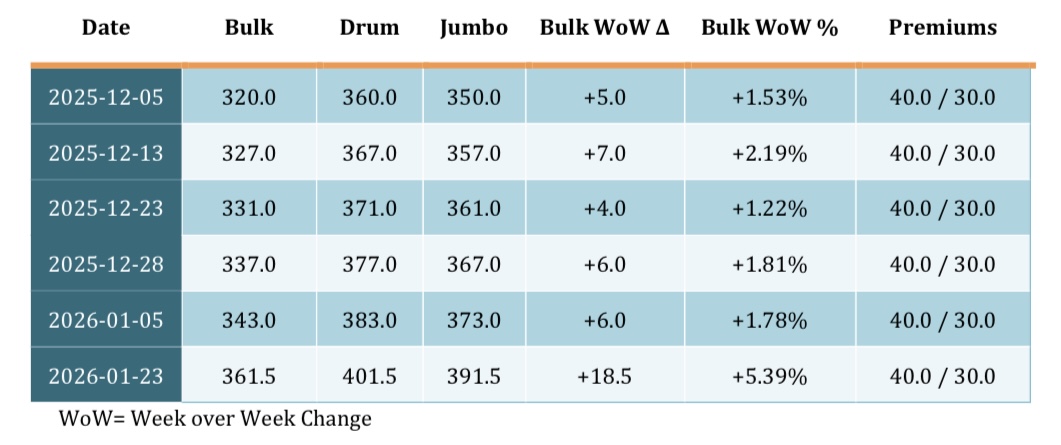 Important note on data handling: The last observation is a reported range; for modeling and charts, the midpoint is used (e.g., 360–363 → 361.5). Where Drum/Jumbo are not explicitly quoted in the source, this report uses a standard packaging premium approach (Drum ≈ Bulk + 40; Jumbo ≈ Bulk + 30) consistent with the provided table. The analysis focuses on directionality, relative moves, and risk ranges—not a single-point certainty.