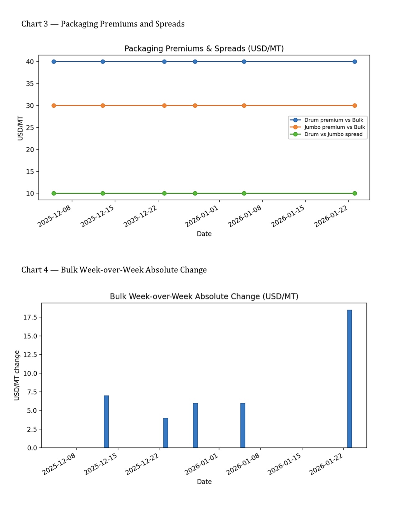 • Packaging differentials (Drum and Jumbo vs Bulk) are stable in the sample; therefore, most of the price risk is bulk-driven.