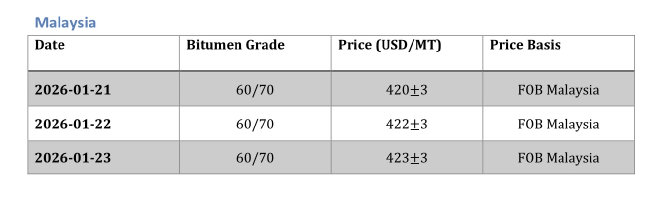 Malaysia’s bitumen prices in January 2026 continued their upward momentum, climbing from early January levels. Strong infrastructure demand and reliance on imported grades supported prices, which firmed toward the mid-$423s per metric ton. This increase reflects healthy post-holiday trading activity and supportive crude oil fundamentals.